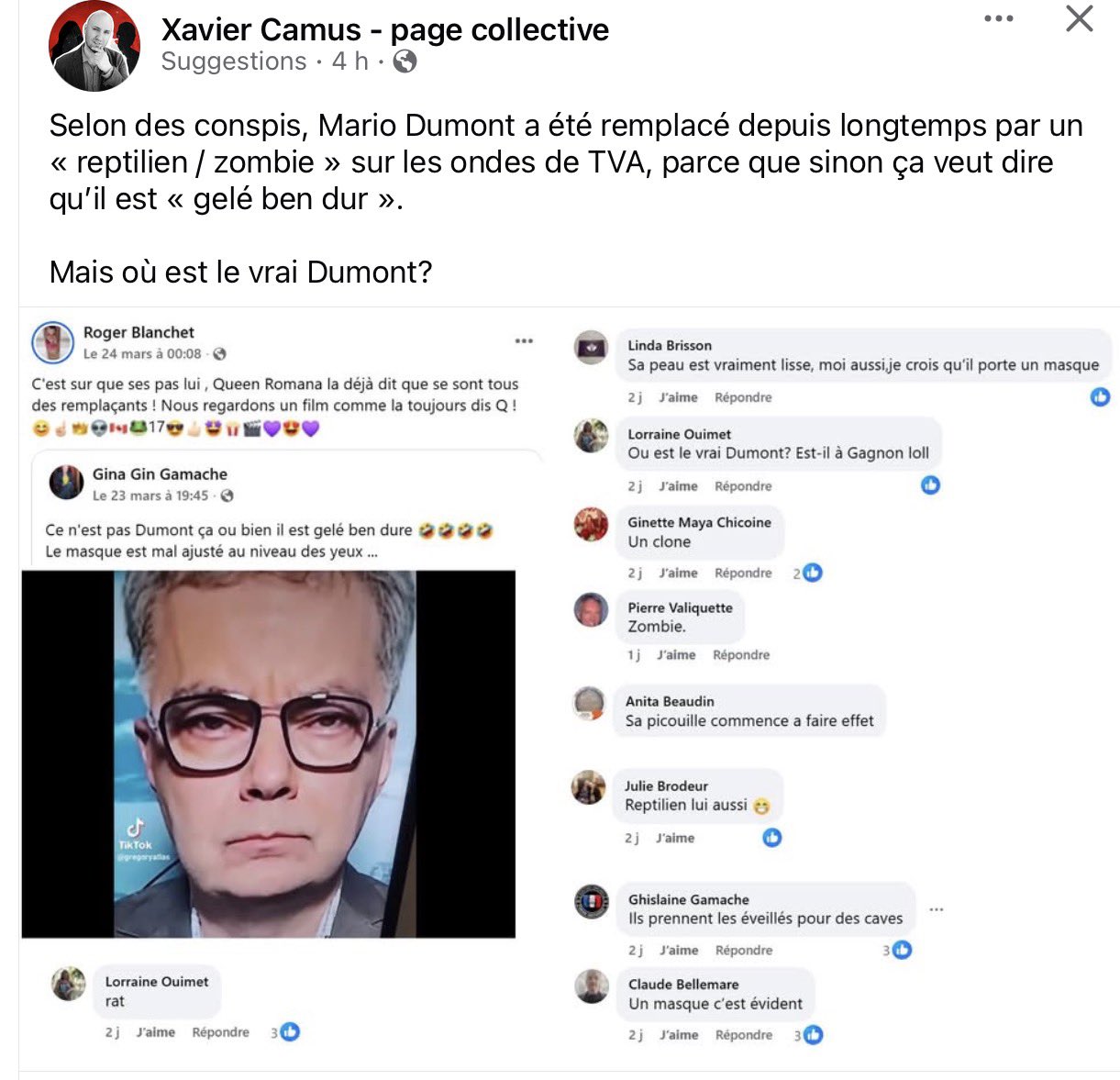 Selon les coucous, Mario Dumont serait un reptilien/zombie! Après Sophie… voici Mario! 😂😂😂😂 Commentaire inutile à m’envoyer: quoique… Navigation des articles ← C’est ben beau une pétition… mais ça prendrait des noms! J’adore lorsque les antifas font des coups d’éclats comme ça! → Label Nom* E-mail Label Nom* E-mail 36 Commentaires Commentaires en ligne Afficher tous les commentaires Téléspectateur endurci. 7 heures il y a C’est quand même vrai qu’à la télé, il en a l’air. C’est vrai que si j’étais marié avec Marie-Claude, j’en aurais l’air moi aussi. Mon Oncle Cochon 4 heures il y a Répondre à Téléspectateur endurci. Je n’arrive pas à croire qu’il est ou a déjà été assez excité pour la mettre dedans et ma réflexion n’a absolument rien à voir avec une rondelle… Colargol le petit ourson 3 heures il y a Répondre à Mon Oncle Cochon Même réussir à avoir un bâton élevé relève du miracle. anonyme 2 heures il y a Répondre à Colargol le petit ourson En tous cas, le tien lève pas ça fait un bout. LOL 7 heures il y a +1 pour la référence à Gagnon, le village abandonné sur la Côte-Nord. Ces conspis sont rendu loin dans leurs délires. Ça s'peut pas 7 heures il y a Répondre à LOL Mais comment se fait-il qu’un pareil crétin enseigne au Collège Ahuntsic ? Quelqu’un peut expliquer ? Rod "pet sauce" Tremblay Ivrogne#1 village Quebec 6 heures il y a Répondre à LOL Zombie? Ouin mon chum Léo « poutine » Gravel…ont pensait que c’était un zombie lui aussi mais finalement c’était juste qu’il était pas mal toujours chaud 24h/24h…on a ben rit… Jean Coutu 7 heures il y a 2 mg lorazepam Merci! 25 mg bid 5 heures il y a Répondre à Jean Coutu c’est pas assez le grand vide 7 heures il y a mais qui est Xavier Camus ? un reptilien une larve ou une limace ? Brute Bernard 6 heures il y a Répondre à le grand vide Un islamo gauchiste de la pire espèce, ils aiment bien s’en prendre au Québécois, il souffre du délire de l’extrême droite. Herbie Enneby 6 heures il y a Répondre à le grand vide Quelqu’un qui enseigne la rigueur intellectuelle à nos enfants. Comme comble de l’ironie, c’est dans mon top 3. No name 5 heures il y a Répondre à le grand vide Les 3! La Clique plate 6 heures il y a Clique, tout le monde se fout éperdument de Camus, parle d’autres choses. Un piéton 6 heures il y a La rumeur selon laquelle la Durocher et Carla Oliveira soient des trans est tout à fait légitime. Je ne dévoile pas mes sources, comme TVA. Kévin Liberter 6 heures il y a Répondre à Un piéton Tu a réson sur tout la ligne. Un piéton Le vrai 2 heures il y a Répondre à Un piéton À moi tu peux me le dire…. L'oeil de Xavier 6 heures il y a Depuis la découverte de Sophie Thibault comme une reptilienne Vous allez en découvrir d’autres. Nous sommes envahis. Sérieusement, je suis surpris que le déranger Camus ne parle pas d’extrême droite. Rob Zombie 6 heures il y a Parlant de zombies: allez regarder les anesthésiants animateurs Patrice L’écuyer et Gérald Fillion à Radio-Canda, pour comprendre ce qu’est vraiment un mort vivant payé par l’état. Sens inné de l'observation 4 heures il y a Répondre à Rob Zombie L’Écuyer ou Roy qui se prend pour un roitelet? . Réal Digère 6 heures il y a Des Zombies dans les médias, il y en a plein. Anne-Marie Dassault, Nathalie Petrouvska, Guy A. Lapage et Monique Girouille pour ne nommez que ceux-là . Comme une odeur de passé date 5 heures il y a Répondre à Réal Digère Tu sembles ne pas savoir la différence entre zombie et momie. Anne-Marie Dussotte et Nathalie Petrobitch font partie de la deuxième catégorie. Pénélaup bateau a woile 5 heures il y a Répondre à Réal Digère Moué si,je fais parti de la gang j'ai 6 ans 2 heures il y a Répondre à Réal Digère ti-jeux de mot hi hi et gna gna gna Camuse 5 heures il y a Xavier Camuse était où pendant un an. Est-ce que le nouveau camuse est un clone reptilien ? Mario n’a pas beaucoup de joie de vivre avec sa face de carême Marie-Claude Brouette 4 heures il y a Répondre à Camuse Je peine à l’avoir, mais je suis effectivement un éteignoir. Les faits 5 heures il y a Quand est-ce que Camus va nous parler de ses amis conspis de gauche qui voient du fascisme partout? On voit Claire maintenant 4 heures il y a Le crane de Mario fait du gigantisme? Le petit Phrénologue en herbe 3 heures il y a Répondre à On voit Claire maintenant Non, il est de descendance somalienne: L👽L 3 heures il y a Ben non, C’est un Oralien Cartman 3 heures il y a Timmy est rendu vieux Zzzzzz 3 heures il y a Hâte, par contre, que Camus soit remplacé par une voilée au Cégep! Mettez-moi ça dehors, ce clown ! Vivre en bon soumis avec une germaine 2 heures il y a Quand ta bonne femme te fait faire le ménage,la toilette,le souper,les déjeuners,les lunchs, l’épicerie etc…. Ça donne ce genre de face le matin ! Lui ,il doit pisser assis!😂 Le Pragmatique 2 heures il y a La technologie rend le tout possible mais la clique de tarés est surtout occupée à s’en foutre plein le nez et est donc nullement capable d’analyser selon les possibilités technologiques. L’IA, les logiciels employés dans le cinémas pour les effets spéciaux, ce sont des sujets que la clique ne maitrise pas !! No name 1 heure il y a Sur la photo de Clique, il a plutôt l’air d’un connard mais qui est assez fou pour remplacer Dumont? No name 1 heure il y a Répondre à No name Et être pogné avec sa grosse?