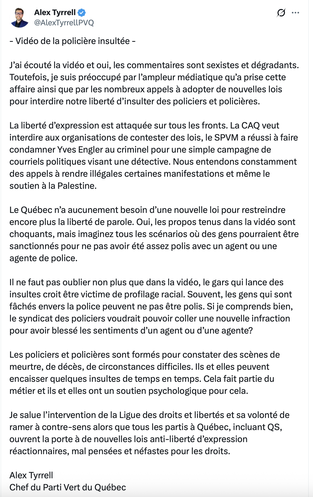 Et je pense aussi qu’il ne met pas l’emphase assez non plus que les actes du petit provocateur-victimisateur (en anglais ils appellent ça «cry-bully») ne devraient pas rester impunis, puisque celui-ci a fait notamment une faute encore plus grave que son geste devant l’agente en propageant publiquement cette vidéo 22 mois plus tard donc ce n’est pas seulement les insultes mais aussi qu’il expose cette agente à re-vivre cette humiliation publiquement à répétition au regard de centaine de miliers de personnes et c’est lui avec pré-méditation qui a choisit avec du recul.