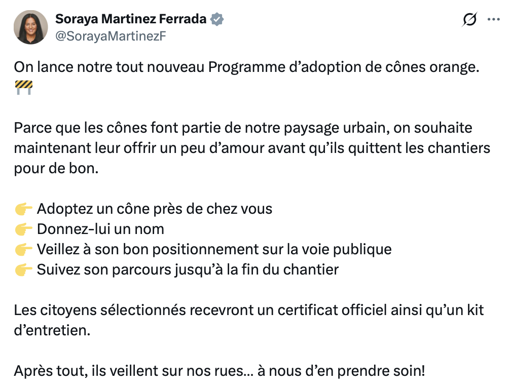 Au lieu de blaguer, allez donc ramasser les cônes qui traînent partout à Montréal. Ce n’est plus drôle.