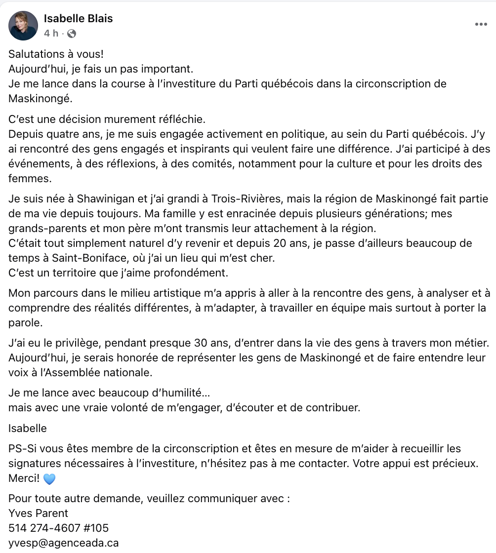 Ce message a été approuvé par la future agente de Isabelle Blais.