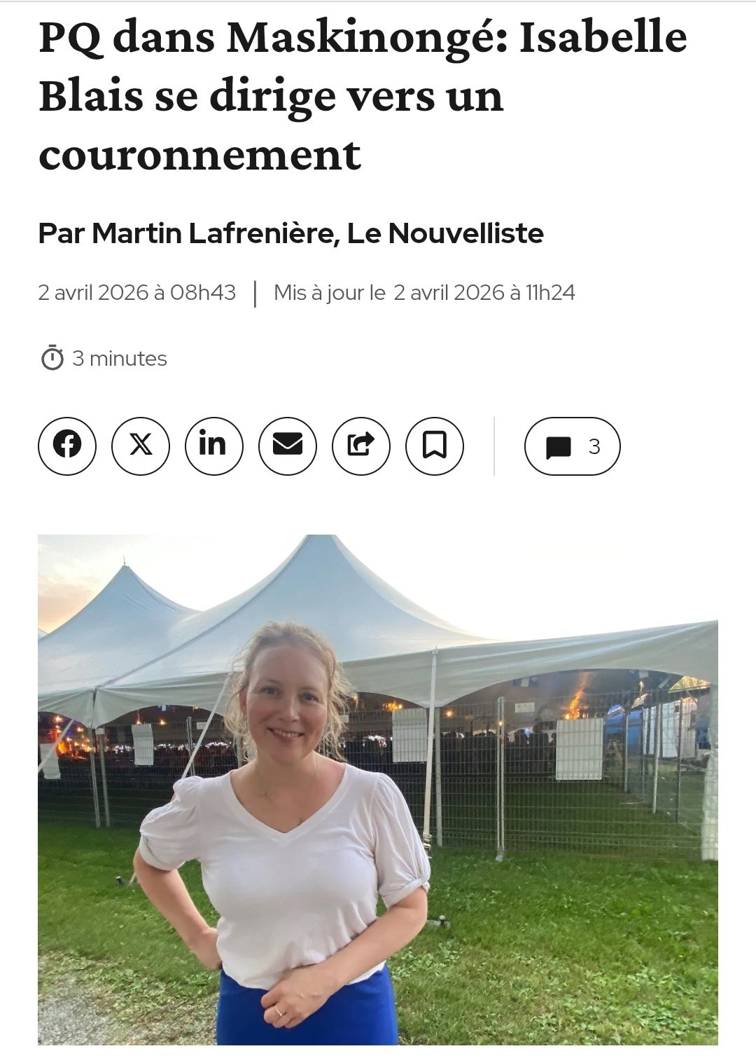 Heureux de lire que Mme Blais fera une excellente candidate. La qualité du recrutement chez le PQ est un bon signe pour les prochaines élections