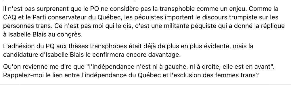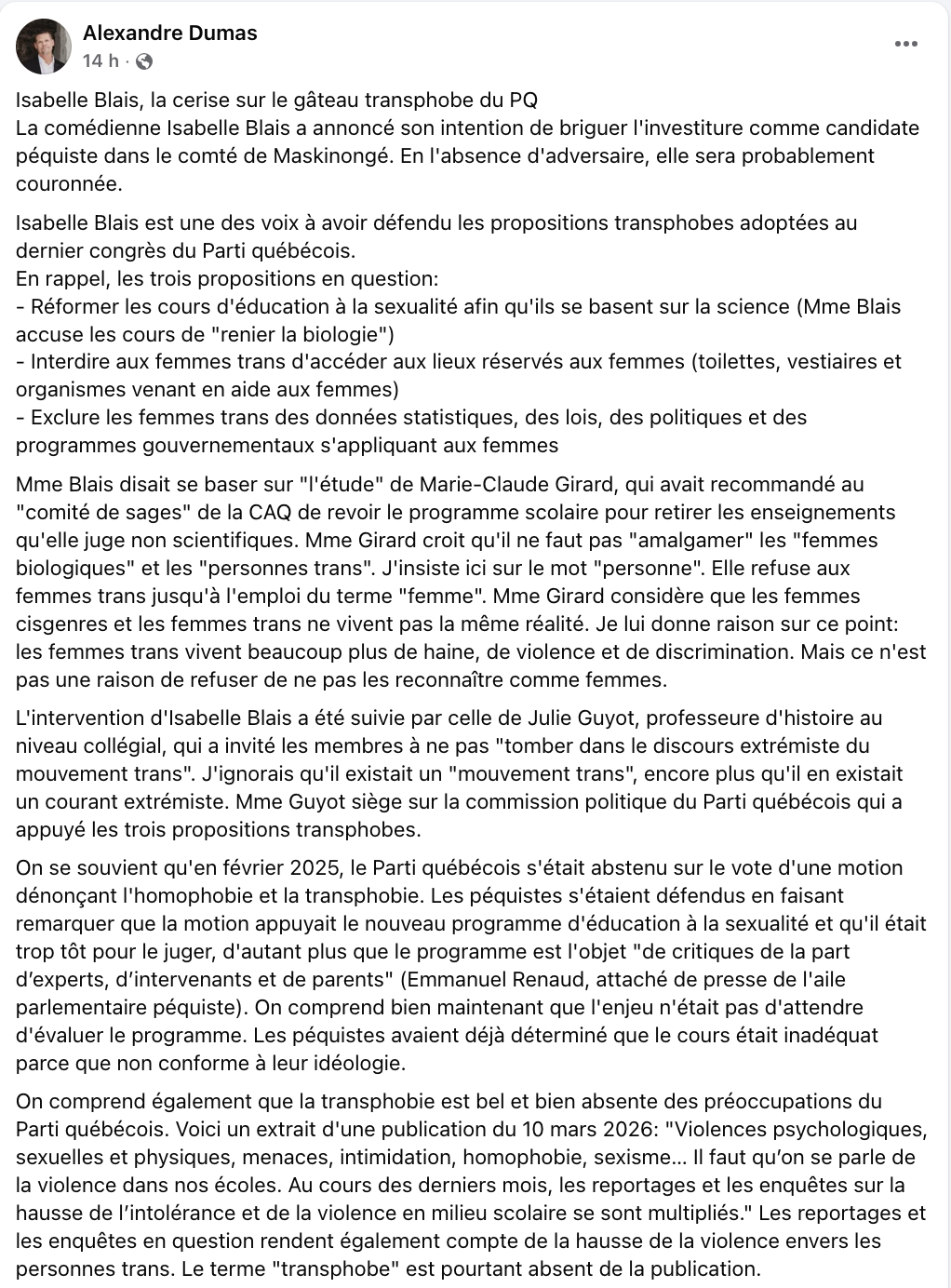 Petit rappel à Alexandre Dumas.Le Parti Québécois et le Québec n’est pas transphobe.Les gens sont écœurés de voir et d’entendre parler de cette « phobie ». De se mettre à genoux devant cette minorité qui abuse du système pour imposer leur agenda qui ne vise qu’a détruire la famille et la société. La « transphobie » n’est pas une phobie mais une écoeurantite aiguë, d’un problème mental chez ces gens.Un homme trans restera toujours un homme idem pour une femme.
