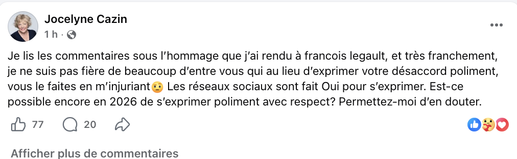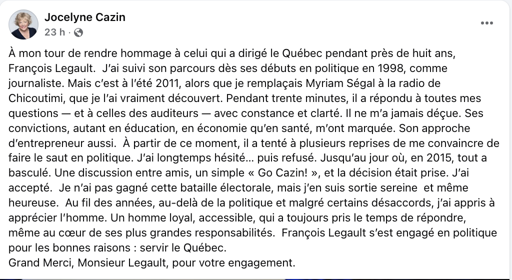 Jocelyne Cazin rend hommage à Legault et est surprise de se faire ramasser! HA HA HA… quelle championne! Tu fermes les commentaires! Commentaire inutile à m’envoyer: parachutée à Québec! Navigation des articles ← Ok, juste pour rire ont vraiment fait le ménage! Label Nom* E-mail Label Nom* E-mail 3 Commentaires Commentaires en ligne Afficher tous les commentaires La journée est encore jaune 34 minutes il y a « Il arrive un âge pour une femme où il ne faut plus porter de décolleté en public!. » – Nathalie Petrovbitch Mon Oncle Cochon 33 minutes il y a Je suis tellement mieux entouré lorsque je me donne toujours à 110 % dans le cadre de «ménages à 3». La journée est encore jaune 2 25 minutes il y a « Si ce n’était le fait qu’on voit la rebord de sa prothèse dentaire en résine, on jurerait qu’elle n’a pas un dentier. » – Olivier Miquette