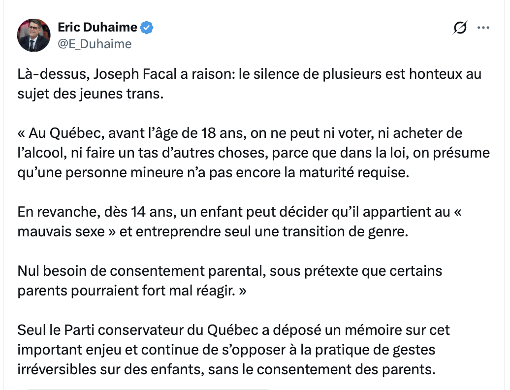 Au Québec, la transition médicale pour les mineurs, c’est possible mais vraiment encadré. Après une évaluation pour une dysphorie de genre, un ado peut parfois avoir des bloqueurs de puberté ou des hormones, avec suivi médical et (dans la réalité) l’accord des parents. Les chirurgies génitales (vaginoplastie, phalloplastie) ne sont pas autorisées avant 18 ans, point. Certaines chirurgies thoraciques comme la mastectomie peuvent toutefois être autorisées, presque toujours avec le consentement des parents. Il faut faire attention au populisme à la Duhaime sur ces questions, parce que ça simplifie à outrance des réalités complexes et peut mener à des jugements mal informés.