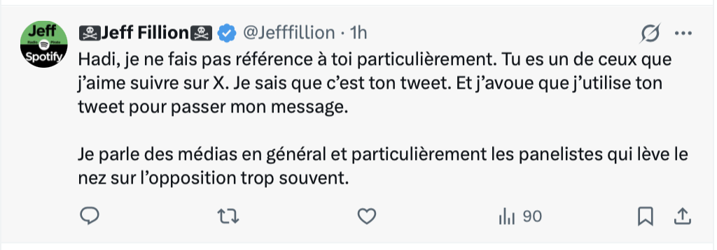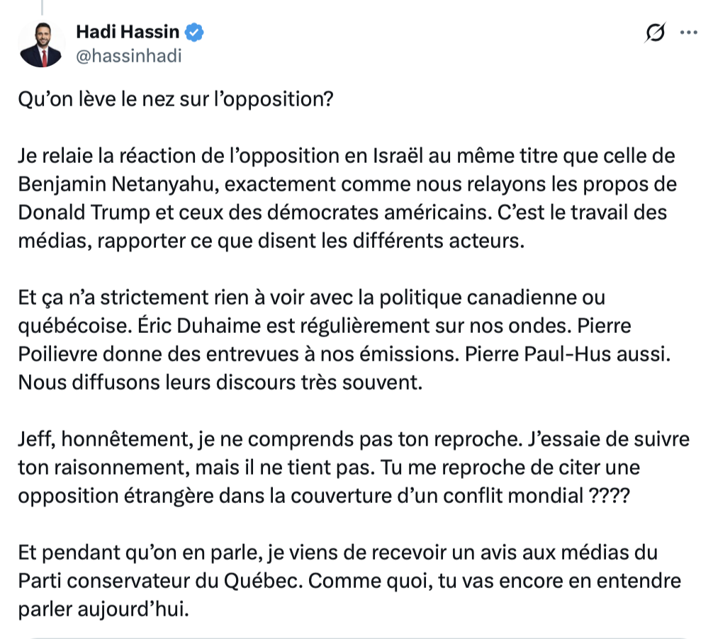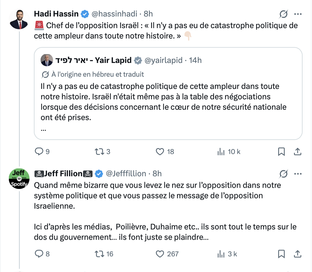 Jeff aime se faire humilier publiquement par un journaliste de TVA! Une fois qu’il se fait remettre à sa place… il s’excuse presque! Commentaire inutile à m’envoyer: pissou! Navigation des articles ← C’est elle qui va remplacer Manon Massé??? Label Nom* E-mail Label Nom* E-mail 2 Commentaires Commentaires en ligne Afficher tous les commentaires Changement de sujets ... 6 heures il y a On essaie de nous faire croire que les ethnies ont peur de la police lollllllllll Déjà vu ! https://x.com/i/status/2041871816449536451 Insomniac 4 heures il y a Tva parle des oppositions au Québec???