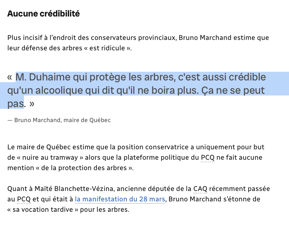 N’ai aucunement envie de défendre ni l’un ni l’autre parce que pas vraiment d’amour pour eux mais il me semble que Marchand voulait utiliser une comparaison et non dire que Duhaime était alcoolique. Mais Duhaime, comme on peut s’y attendre, utilise cette mauvaise comparaison de Marchand pour la tourner à son avantage et s’en faire du capital politique.