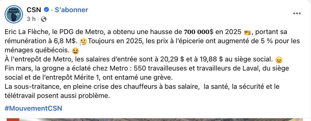 Si le PDG de Métro inc avait travaillé bénévolement et que son salaire de 6.8M avait été partagé aux 99 000 employés du groupe, ça aurait permis à chacun de récupérer 68,69$ pour l’année. Si on ramène ça sur 35h semaine, ça fait moins de 0,04$/heure. Aussi, le chiffre d’affaire annuel est de 22 milliard de $. Le salaire complete du PDG représente 0,30$ pour chaque 1000$ dépensé par un client. Ce n’est pas un game changer. Par contre, sur une base de 35h par semaine, augmenter les 99 000 employés couterait directement au client 8,19$ par tranche de 1000$ d’achat. Je propose un deal à la CSN. Je vous donne 0,05$/h d’augmentation pis vous retournez travailler!