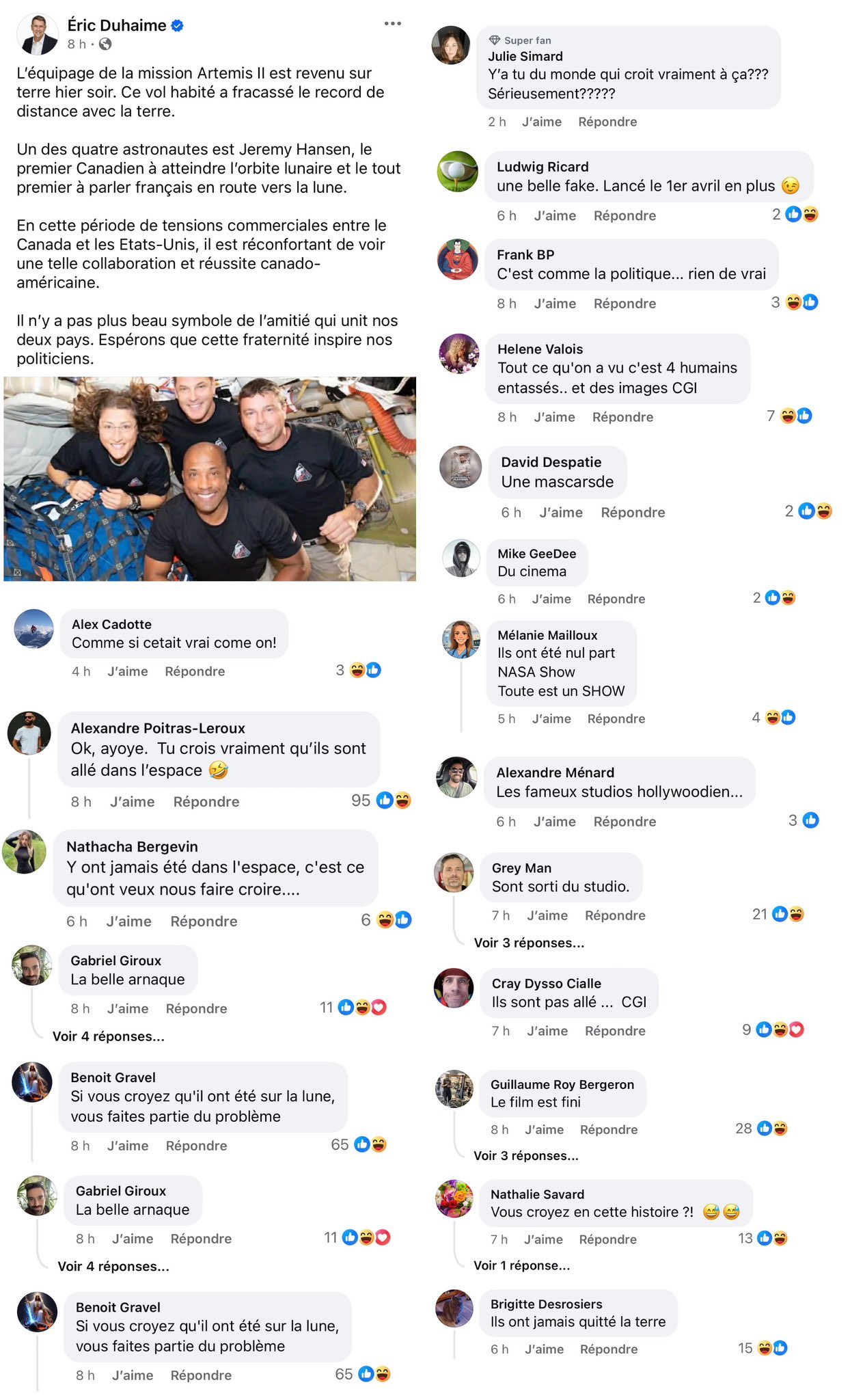 Demandez lui ce qu’il pense des incultes politiques qui affirment que la mission Artemis a été « tournée » devant un écran vert… Sa réponse; « on doit les respecter, ces gens là ont droit de vote et à leur libârtéyi d’opinion… »