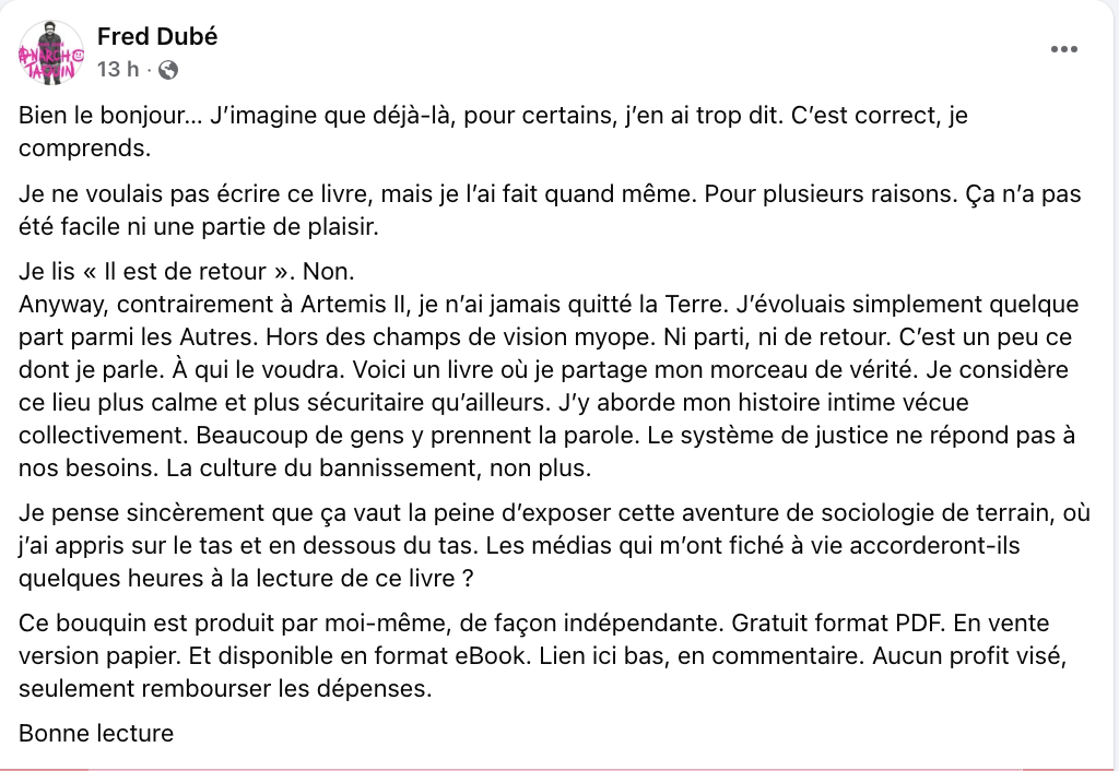 Le chef-d’œuvre littéraire de Fred Dubé promet de captiver une foule immense, composée exclusivement de lui-même. Notre cher « humoriste » national ferait mieux de se reconvertir en guide touristique au Mur des Lamentations ; il pourrait y escorter sa joyeuse troupe de victimes professionnelles de la cancel culture afin qu’ils puissent enfin s’agglutiner avec dignité dans les tréfonds de l’oubli…