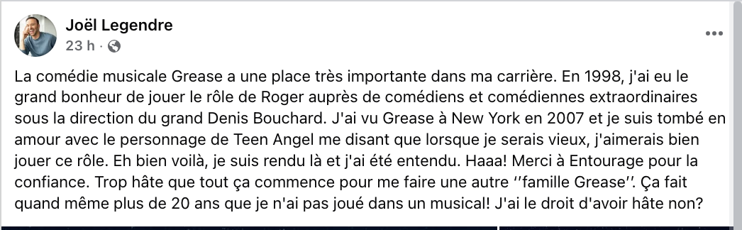 C’est pour ça que c’est important de subventionner la culture Quebecoise. Grease, ça parle de nous autres, de notre identité, de notre langue, pis de notre Histoire comme peuple colonisateur. C’est important que les artistes soient reconnu pour le travail qu’ils font.