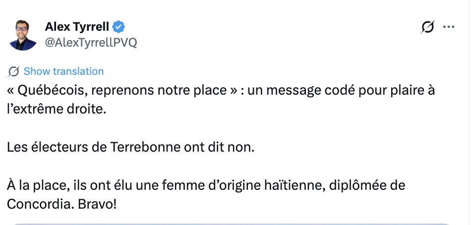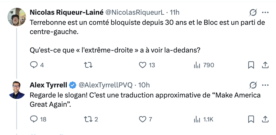 On peux-tu lâcher l’expression à Trump, extrême droite et extrême gauche. Dans le cas du Québec et canada c’est plus du à droite ou à gauche, simplement.