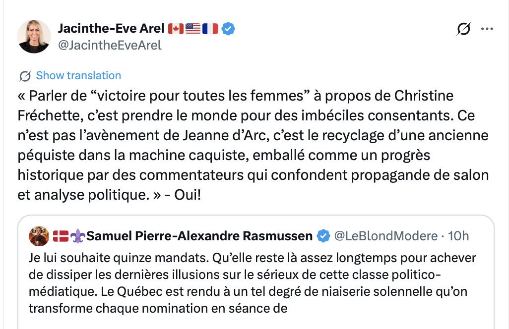 C’est tellement important les femmes en politique surtout une excellente chroniqueuse comme moi d’origine Marocaine secrètement rémunérée par le QLP et mon cher Liberal Party of Canada pour mépriser les petits québécois de souche avec le soutien inconditionnel de LCN et de Paul Larocque.