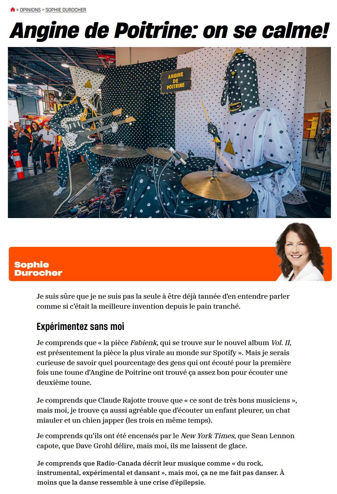 Il est évident que Sophie Durocher n’apprécie pas le math-rock. Si elle ressent le besoin d’écrire à ce sujet, c’est son problème. Moi j’en ai rien à foutre de Sophie Durocher, les gens lui donnent trop d’importance …