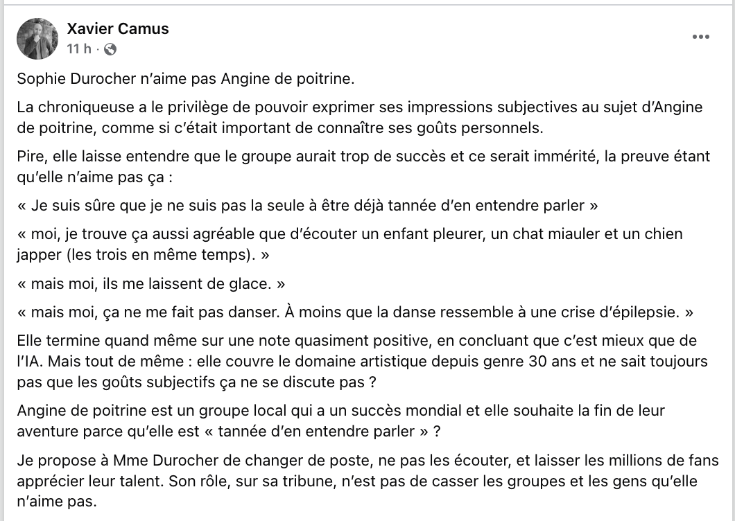 Bon post de Camus. Il y aurait bien d’autres choses à s’indigner ou à chroniquer plutôt de se choquer du succès d’un groupe québécois.