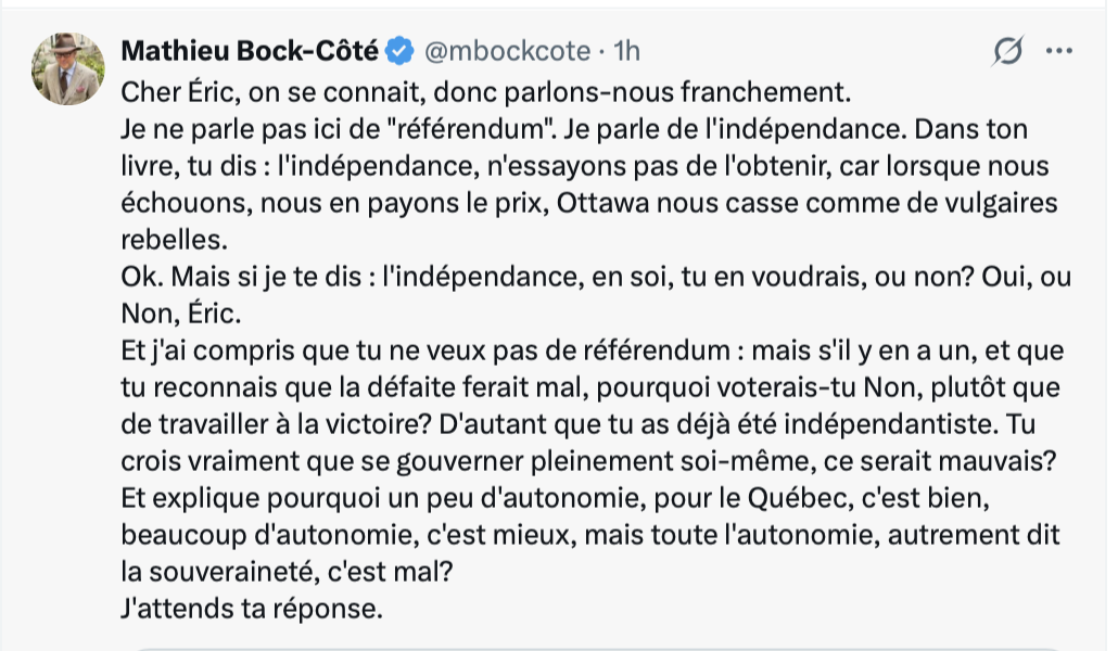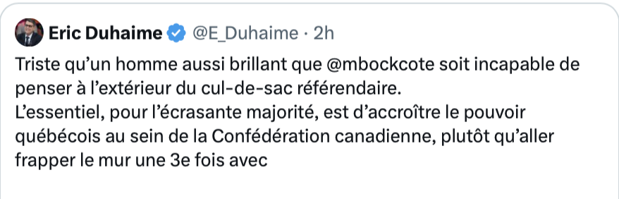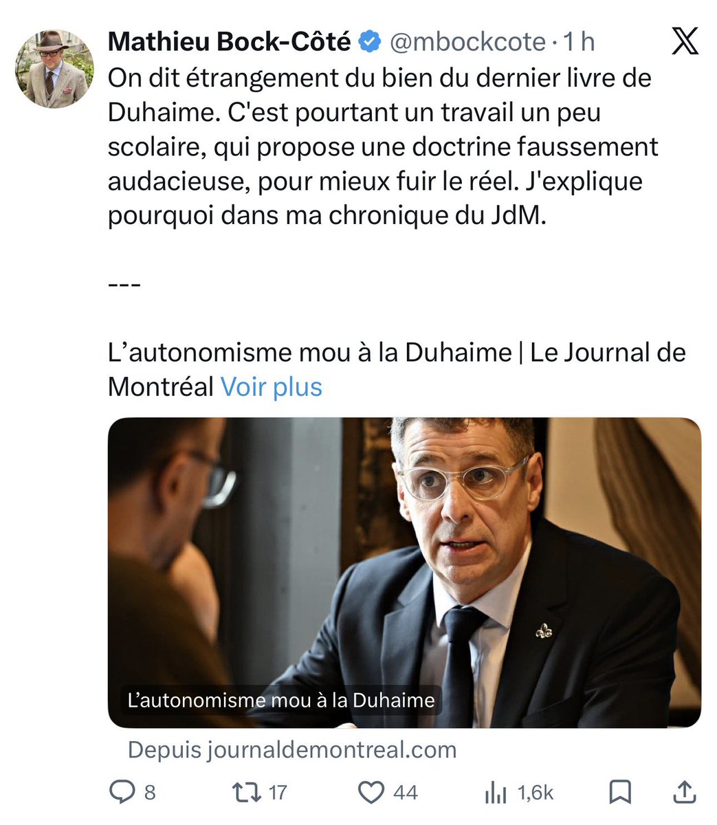 Il s’attend à quoi Bock Côté? Est-ce qu’il pense que Duhaime le démagogue va s’aliéner ses électeurs de Québec en se prononçant pour l’indépendance du Québec! Ça prend pas un diplôme en sociologie de l’UQAM ou une chronique dans le Hournal de Montréal pour comprendre ça!!