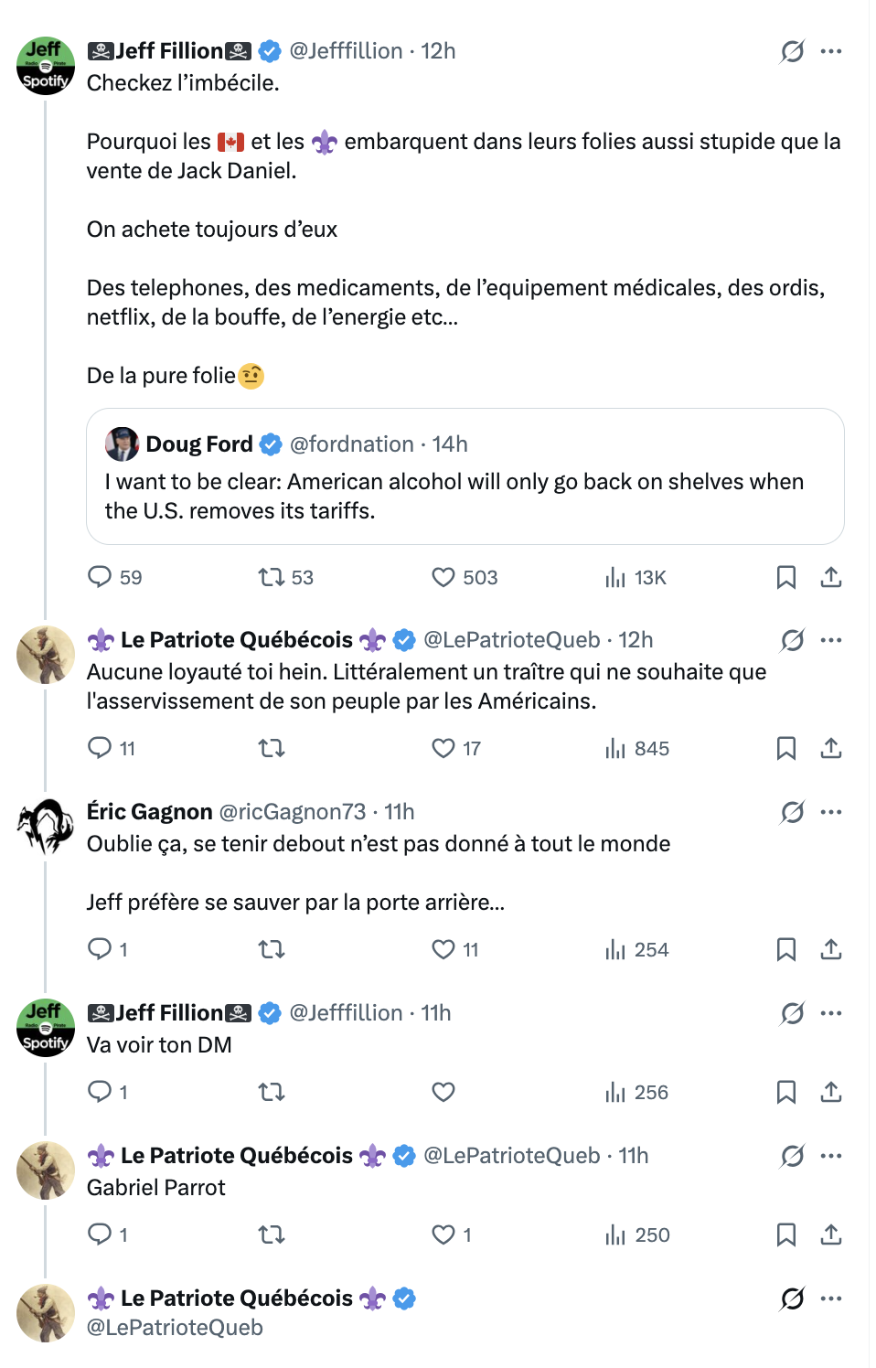 Lorsque Jeff Fillion t’appelle live pour te chi** dessus! MAN!!! 😂😂😂😂 Commentaire inutile à m’envoyer: c’est un honneur! Navigation des articles ← Lorsque Family Guy débarque à … Toronto! Vous n’avez rien fait pendant 8 ans… et ça va changer maintenant, les clowns!!! → Label Nom* E-mail Label Nom* E-mail 15 Commentaires Commentaires en ligne Afficher tous les commentaires hellbow ops 7 heures il y a Boycott des américains = signalement de vertu Vive le Québec libre 7 heures il y a Exactement l’image qu’on se fait du patriote québécois…! Bofff 6 heures il y a Répondre à Vive le Québec libre Il est brave et il montre son viage, exactement l’inverse des ti-pirates. Un piéton 5 heures il y a Répondre à Bofff Il a probablement sa carte du PQ et son passeport québécois en plus. Né pour un p'tit pain (retour temporaire) 6 heures il y a Répondre à Vive le Québec libre Blanc, laid, célibataire, pauvre, sous-éduqué, chialeux, jaloux, etc. Pauvre petit paysan Kebs francophone analphabète… Ça fait vraiment pitié !! On veut un pays !! 🇨🇦 Idiots utiles 3 heures il y a Répondre à Né pour un p'tit pain (retour temporaire) Mais mais mais… Hier, tu nous faisais la leçon en stipulant qu’il ne fallait pas faire de fausses divisions et qu’il n’y avait que NOUS (soit tout le monde collectivement réuni). Et ce matin, tu chies sur les Québécois. Tu es fascinant à lire. Tu me fais penser au gars dans ce intitulé Colin Drains the Internet : youtube.com/watch?v=z_brpPpjZ5I&time_continue=3&source_ve_path=NzY3NTg&embeds_referring_euri=https%3A%2F%2Fwww.google.com%2Fsearch%3Fq%3Dsketch%2Bman%2Buses%2Binternet%2Bto%2Bdrain%2Bpeople%2527s%2Benergy%26oq%3Dsketch%2Bman%2Buses%2Binternet%2Bto%2Bdrain%2Bpeople%25 Une fille de l'UQAM 7 heures il y a Le Québec a autant besoin de Filion que d’une gonorrhée pustulente Morpion 6 heures il y a Répondre à Une fille de l'UQAM «Gonorrhée pustulente», c’était mon surnom quand j’étais chez les scouts.» – Charles Milliard Correction 5 heures il y a Répondre à Une fille de l'UQAM Le Canada a autant besoin du p’tit pain maghrébin que d’une gonorrhée pustulente Peter B. Parker 7 heures il y a Jeff agit comme un bully de 5´6’’ depuis longtemps. S’il avait le moindrement la capacité de se remettre en question, il ne passerait pas sa vie à se chicaner sur Twitter. C’est pas mal ce qu’il y a de plus gentil à dire sur lui. Euh... 5 heures il y a Répondre à Peter B. Parker C’est le syndrome du « bout de cul » ! NOWA HUTA 6 heures il y a Y’a le même teint orange que l’autre 🤡 Do Ré Mi Fa Sol Zanetti 4 heures il y a Pourquoi juste un screenshot de la face a Fillion, mais pas une vidéo et ce qu’il disait? Le gars s’est fait humilier? Justin en direct de la Californie 3 heures il y a Continuez de boycotter les clowns Toute est woke pour les attardés 1 heure il y a Y’aurais pas 2-3 antifa a Kébek pour régler le problème à Zeff?