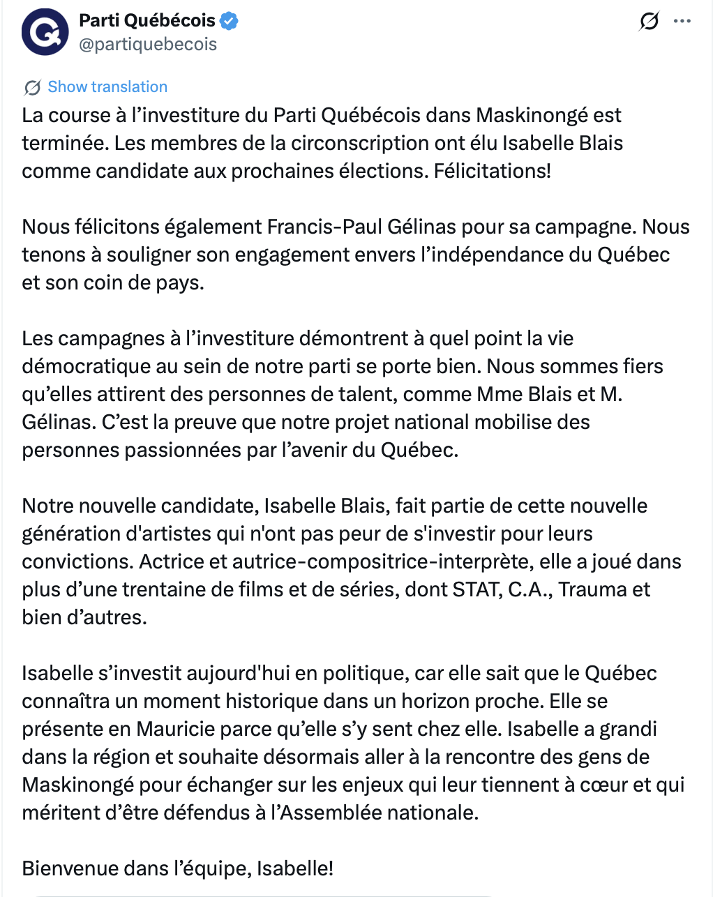 Les matantes l’ont tellement aimée dans le téléroman où elle a joué il y a quatre ans qu’elles vont voter pour elle sans trop de problèmes. La politique au Québec est devenue une grosse farce finalement pas très drôle.