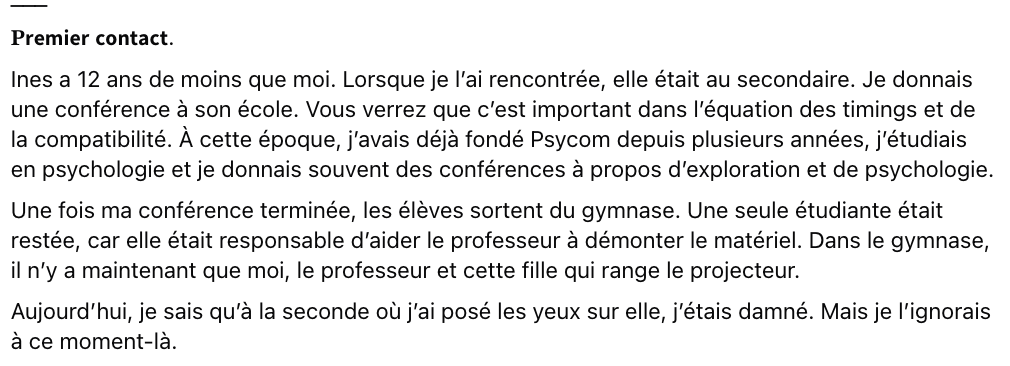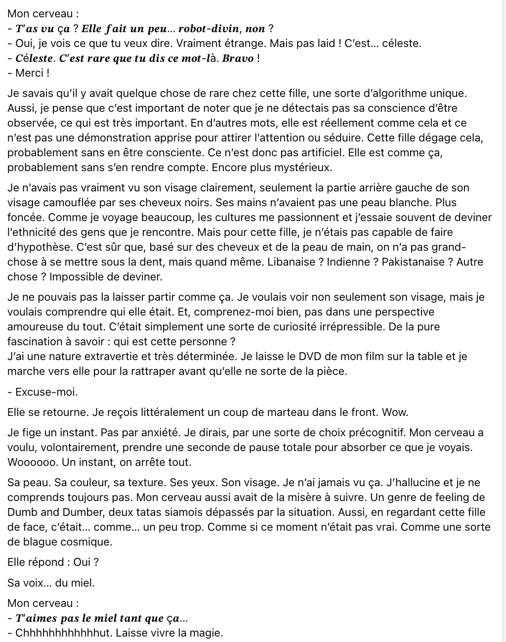 Ce texte sur une histoire d’il y a 15 ans d’une rencontre de 2 personnes aujourd’hui marriées aurait pu faire 2 paragraphes au maximum au lieu de 13 ça aurait été moins malaisant.