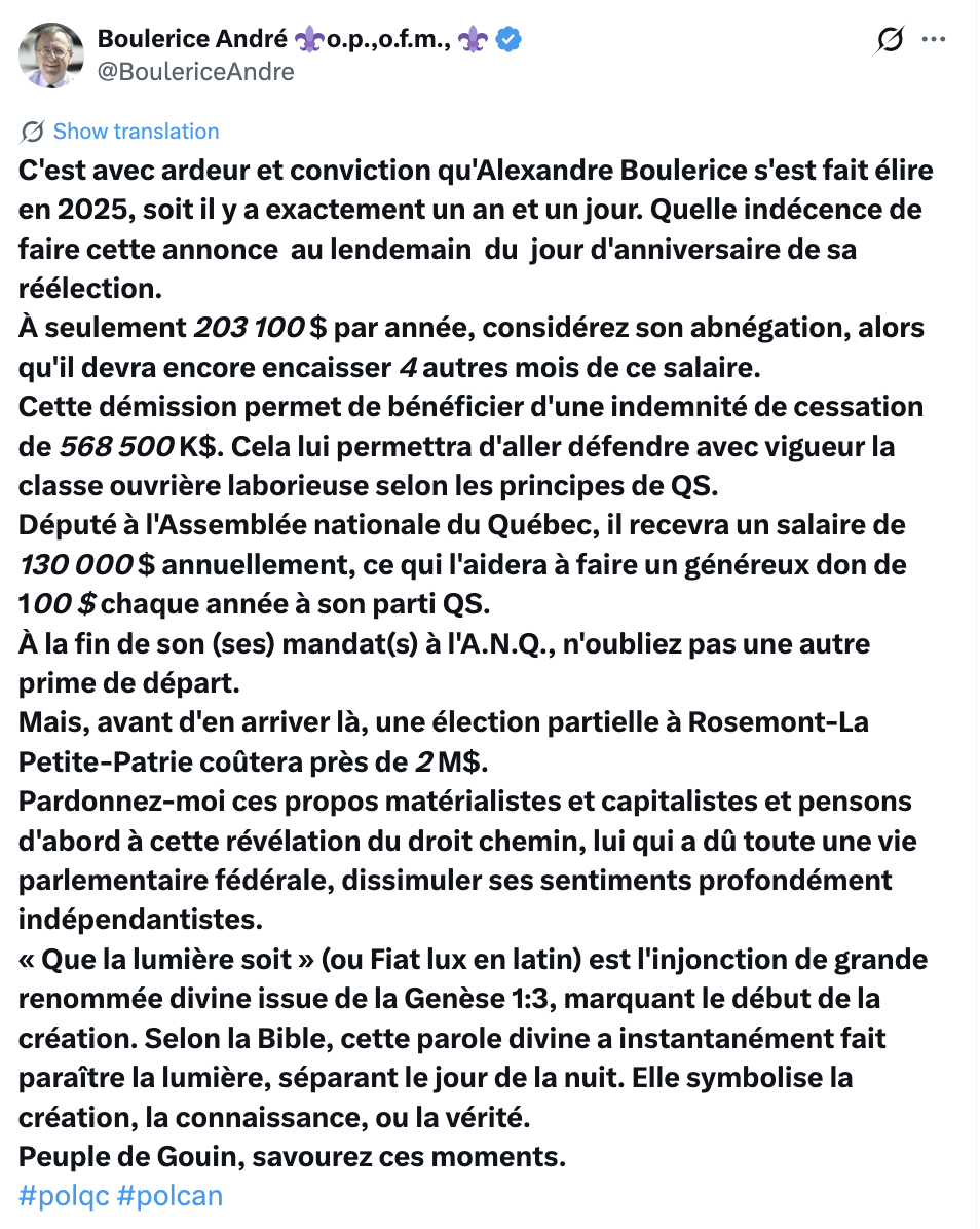 D’abord Fréchette, celle que l’on compare à Carney et qui devient première ministre du Québec et qui fait un début fulgurant dans son nouveau poste. Imaginez… elle va même jusqu’à défendre le Québec à Washington, puis v’là le célèbre Boulerice qui arrive au Québec avec toute son expertise. Tous ces malheurs qui vont encore nous enlever des votes qui, eux, se font de plus en plus rares dans notre camp.