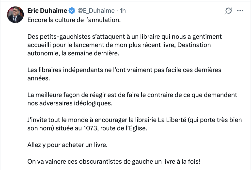 À Québec, la librairie La Liberté critiquée pour avoir accueilli le lancement du livre d'Éric Duhaime https://t.co/tjIerZJpEJ